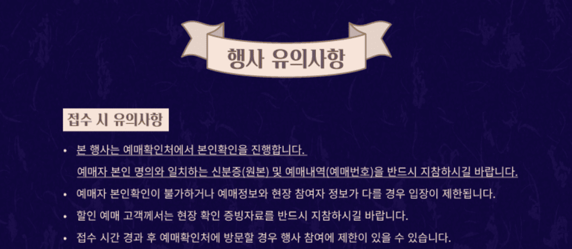 예매시 본인 명의로 예매해야하면, 예매정보와 현장 참여자 정보가 다른 경우에는 입장이 제한됩니다.