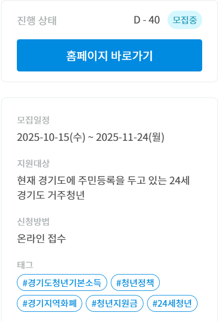 경기도 거주 청년에게 분기별 25만 원씩 최대 100만 원의 지역화폐를 지원하는 제도입니다.