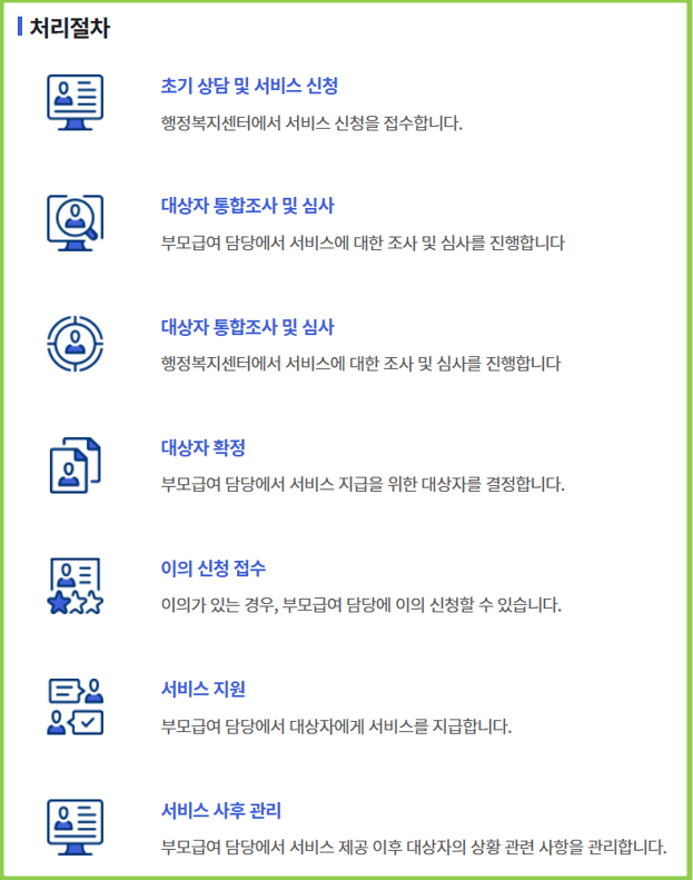 행정복지센터에서 서비스를 신청> 부모급여 담당에서 서비스에 대한 조사및 심사진행>행정복지센터에서 서비스에 대한 조사및 심사 진행> 부모급여 담당에서 서비스 지급을 위한 대상자를 결정>이의가 있는 경우 부모급여 담당에게 이의를 신청> 부모급여 담당에서 대상자에게 서비스를 지급> 부모급여 담당에서 서비스 제공후 대상자의 상황관련 사항을 관리