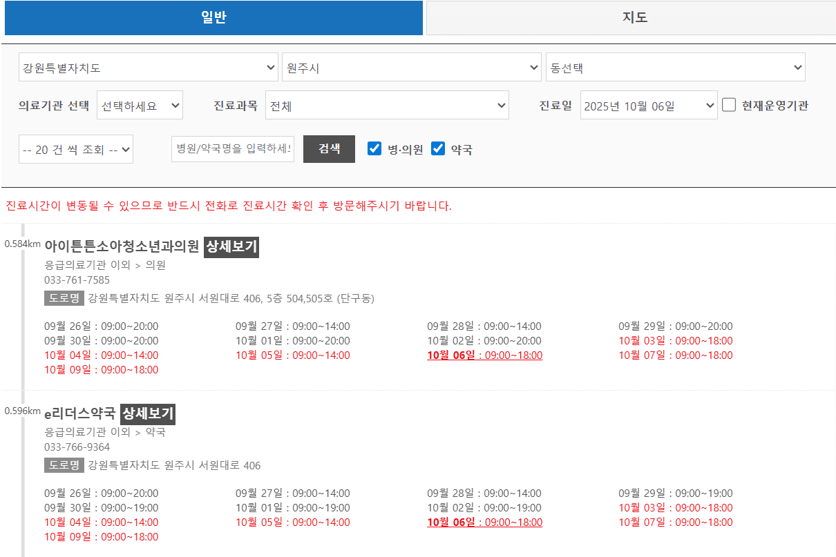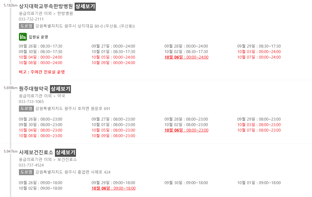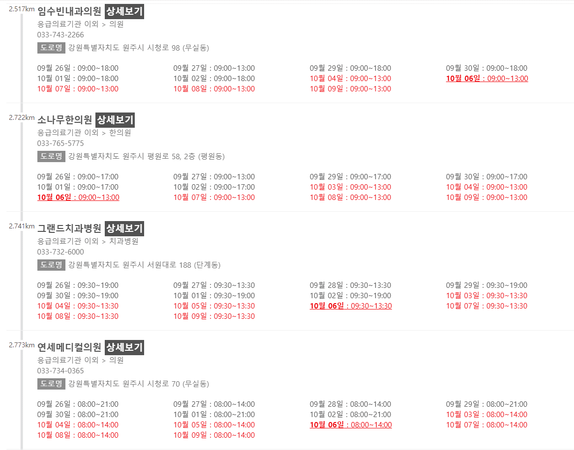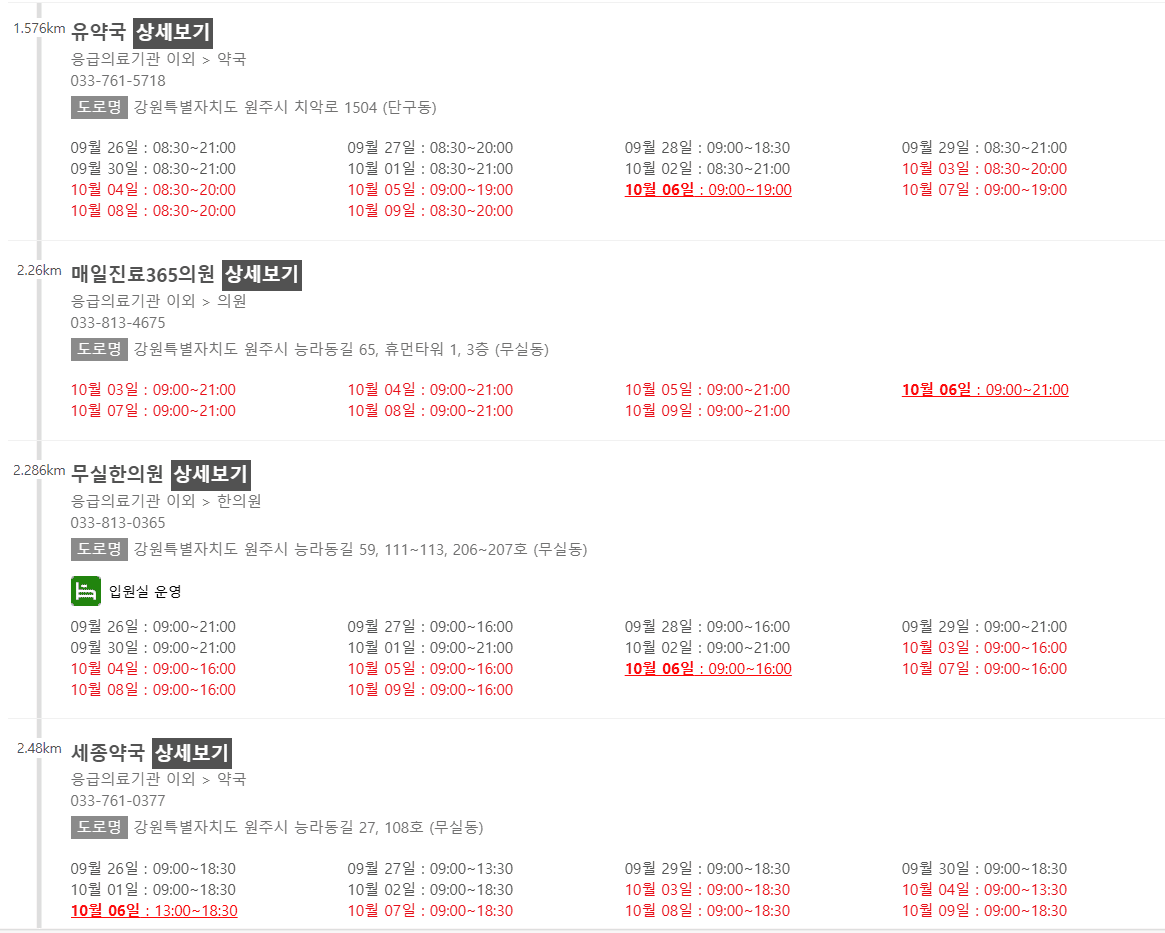 강원 원주시 10월 6일 운영 병원/의원