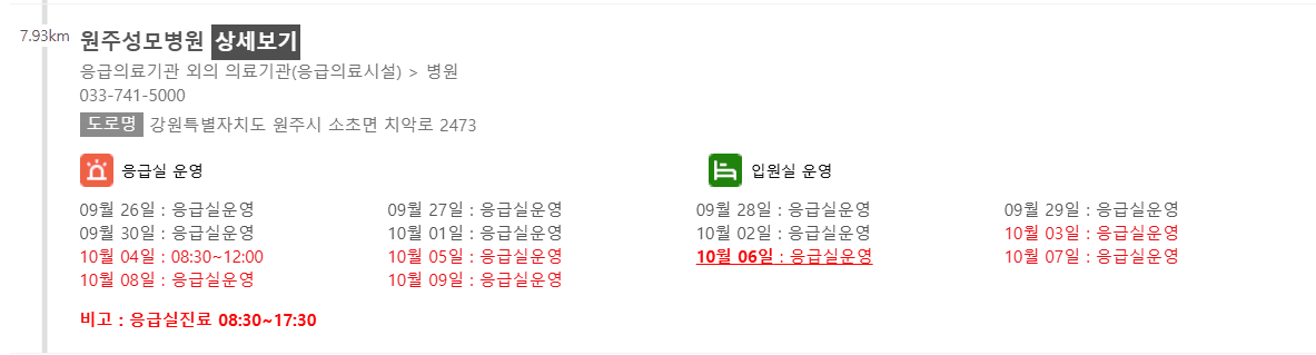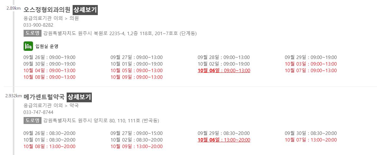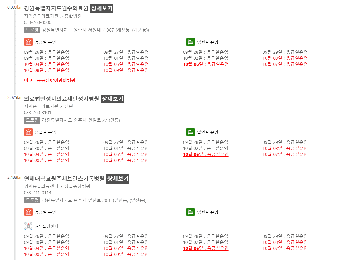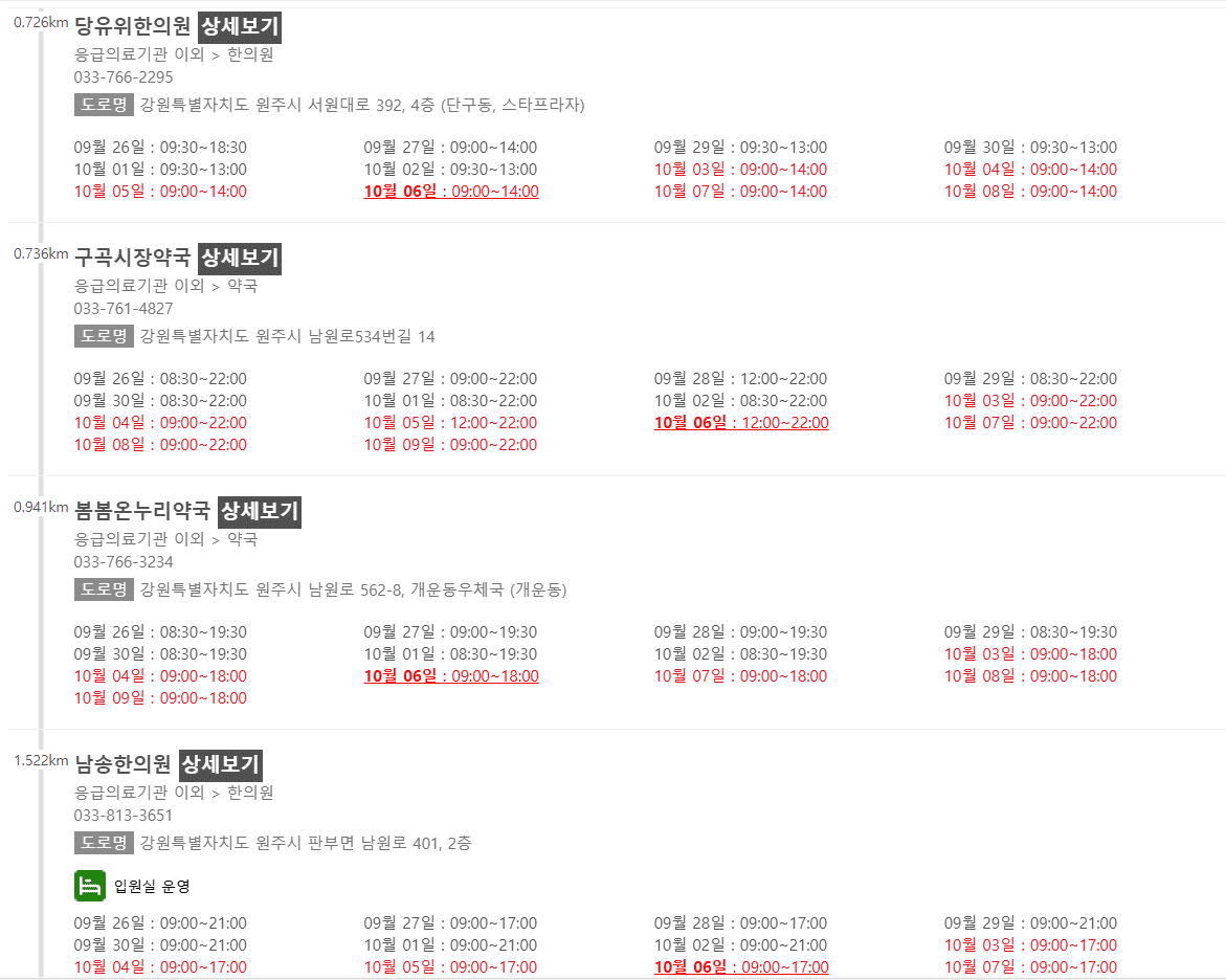 강원 원주시 10월 6일 운영 병원/의원