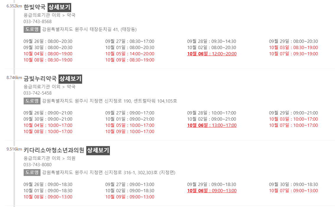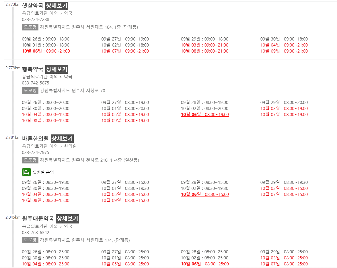 강원 원주시 10월 6일 운영중인 약국리스트