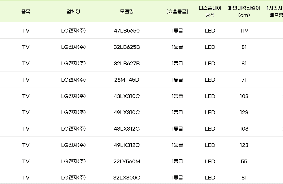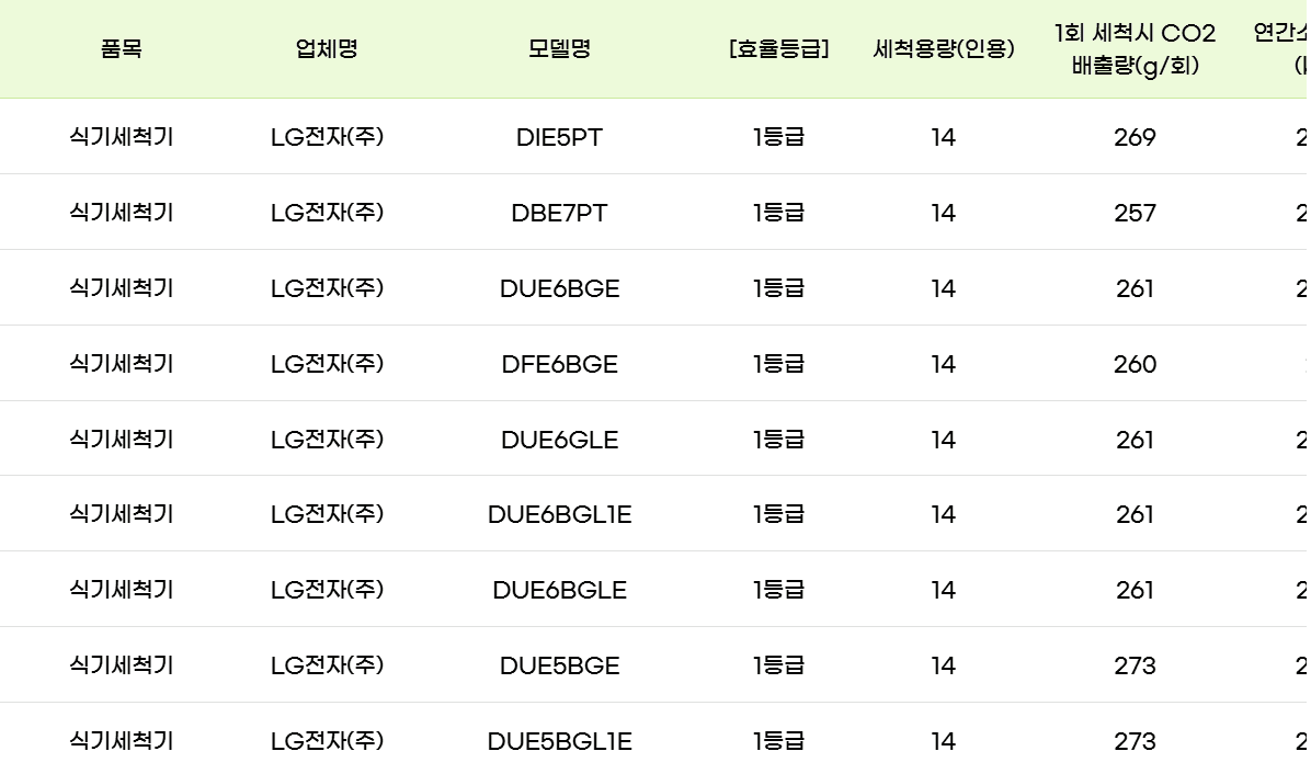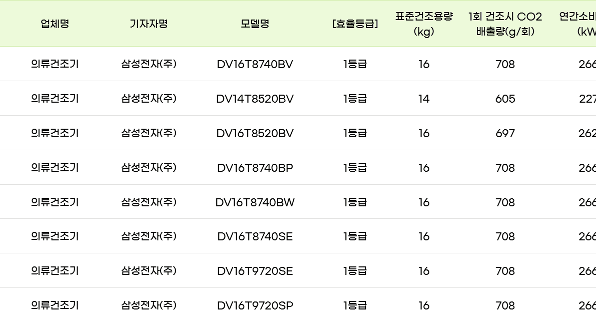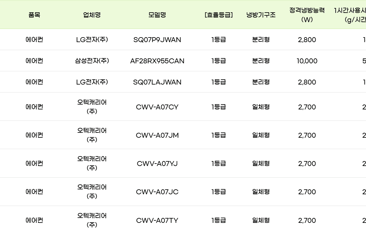 다음 11개 품목이 검색 대상이며, 모두 '최고 효율 등급'을 충족해야 합니다.