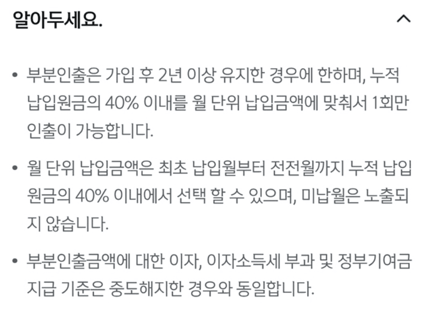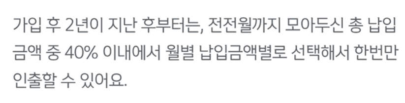 A. 가입 2년 이상, 1회에 한해 최대 납입액의 40%까지 인출 가능하며, 중도해지 이율이 적용됩니다.