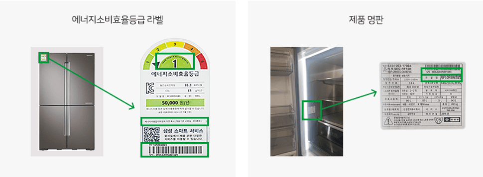 제품의 뒷면 또는 측면에 부착된 ‘에너지등급 라벨’과 ‘제품 명판’을 확인해야 합니다.