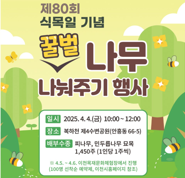 | 식목일 기념 묘목 나눔 | 4월 4일(목) 10:00~12:00 | 복하천 제4수변공원 (안흥동 66-5) 피나무·민두릅나무 1,450주 무료 배부 (1인당 1주) 대상: 이천시민 및 단체 (약 1,000명) 문의: 031-645-3848 |